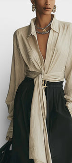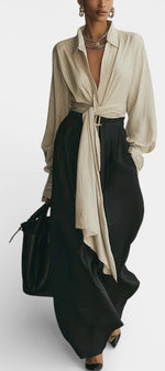 Épuré et naturellement élégant, l’ensemble Sallie incarne une allure moderne tout en douceur. La chemise beige à lacets apporte une touche raffinée et féminine grâce à son détail noué à l’avant, qui permet d’ajuster la silhouette avec subtilité. Associée à un pantalon noir à jambes larges, elle crée un contraste chic et équilibré, parfait pour un style à la fois décontracté et soigné. Le tissu fluide accompagne les mouvements avec aisance, offrant un confort élégant tout au long de la journée.