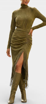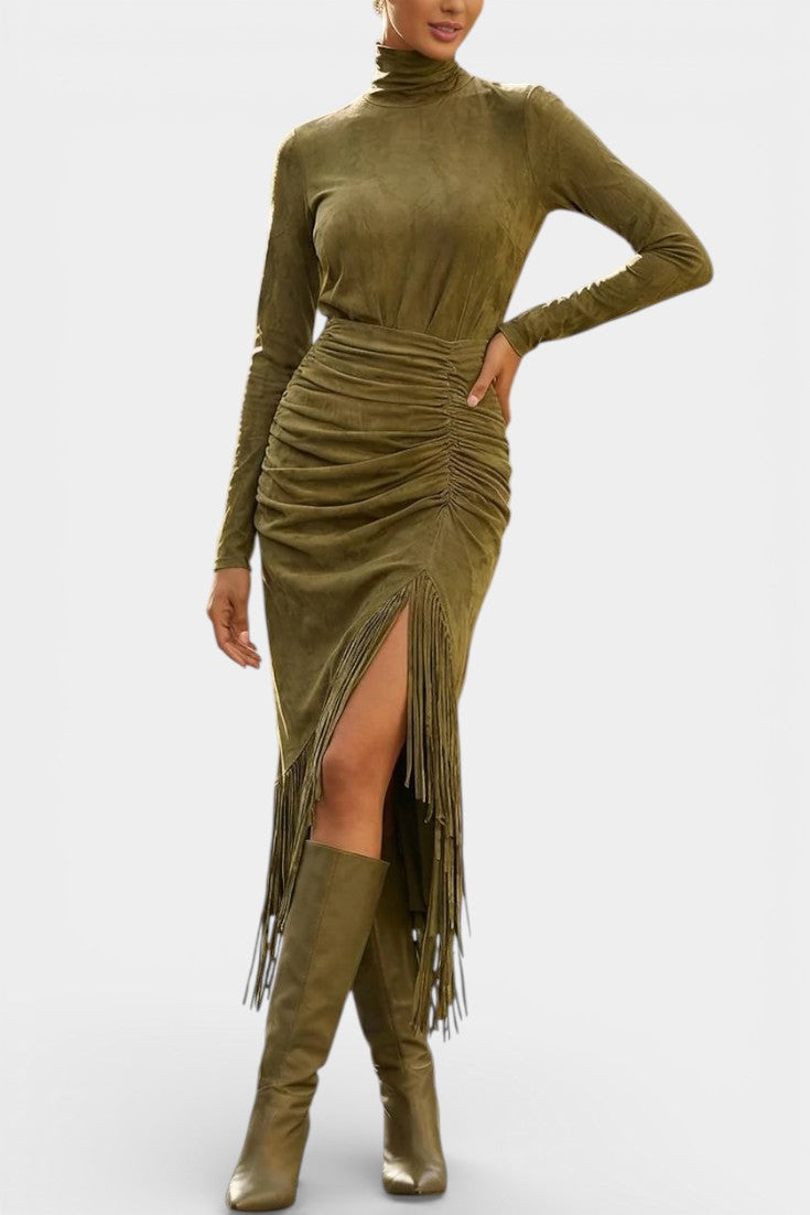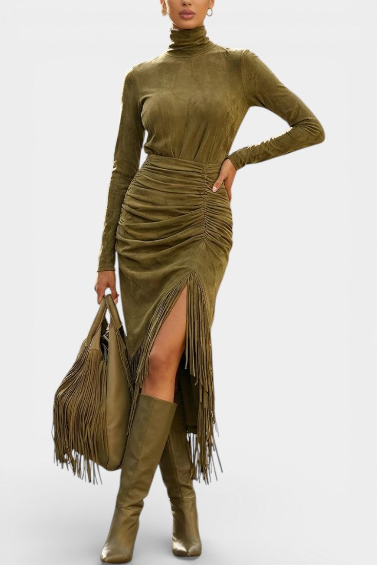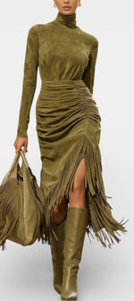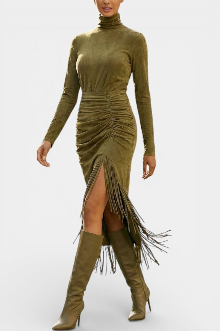 Mystérieuse et captivante, la robe Solaria incarne une élégance bohème au charme hivernal affirmé. Sa silhouette longue et ajustée en suédine douce épouse les lignes avec finesse, tandis que le col montant apporte une allure sophistiquée et élancée. Les franges délicatement intégrées et le drapé subtil créent un mouvement gracieux à chaque pas, renforcé par une fente latérale qui dévoile juste ce qu’il faut. Une pièce au caractère vintage, pensée pour marquer les esprits avec assurance et raffinement.