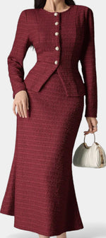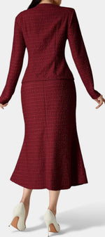 Portez l’ensemble avec des escarpins sobres pour une élégance classique, ou avec des bottines à talon pour une touche contemporaine. Ajoutez des bijoux discrets afin de laisser le tweed et la coupe sirène exprimer toute leur force stylistique.
