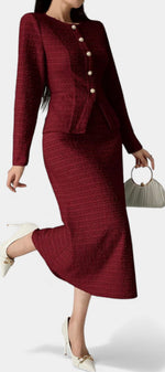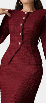 Un ensemble au charme couture qui incarne une élégance structurée et intemporelle. Véronique associe une blouse en tweed au col rond épuré à une jupe midi sirène qui épouse la silhouette avec finesse. Le tweed apporte texture et distinction, tandis que la coupe travaillée de la jupe souligne les courbes avec sophistication et équilibre. Une tenue pensée pour une allure affirmée et parfaitement maîtrisée.