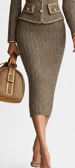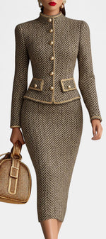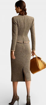 Un ensemble au charme intemporel qui conjugue élégance classique et sophistication contemporaine. Vireya séduit par son tissu herringbone texturé, emblématique du style vintage, et par sa veste à col montant qui structure la silhouette avec distinction. Les boutons métalliques à finition dorée apportent une touche précieuse et raffinée, tandis que la jupe assortie crée une allure cohérente, élégante et parfaitement maîtrisée. Un deux-pièces pensé pour celles qui aiment affirmer leur style avec subtilité et caractère.